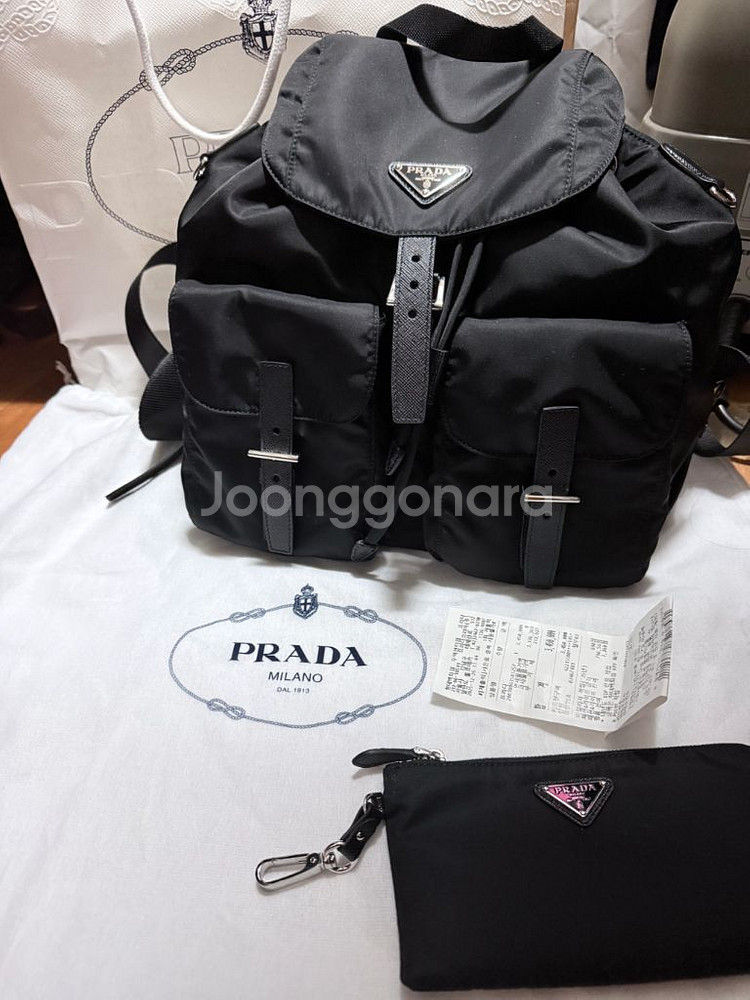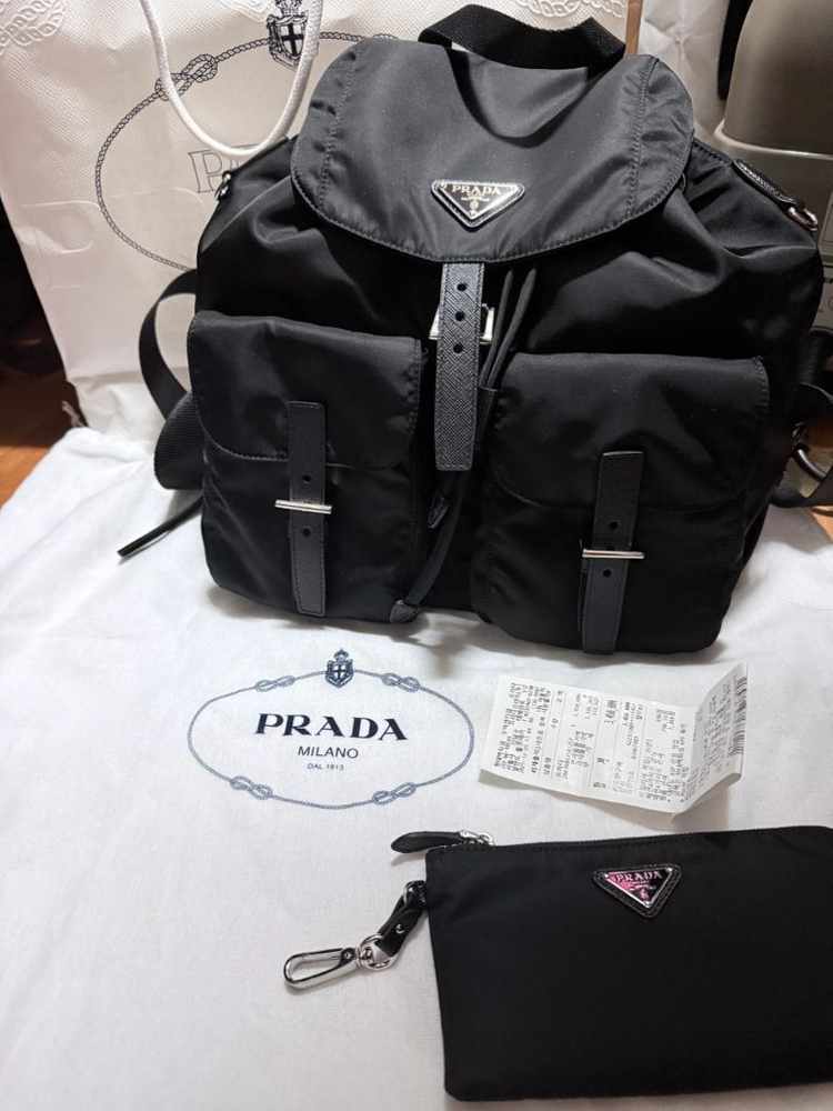 프라다 리나일론 백팩 미디움 블랙입니다!(새것) - 가볍고 수납이 용이해서 데일리 백으로 좋아요 - 현대백화점 무역센터점에서 345만원에 구매했습니다 - 2025년 12월 26일구매영수증 - 백팩, 파우치, 더스트백, 구매영수증, Bag&Sense 가방 정리대 함께 드립니다 6만3천원들었어요.