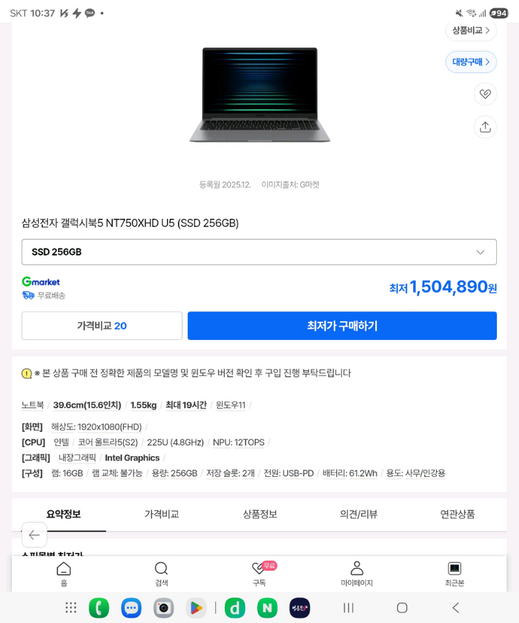 화면. [15인치] CPU [울트라5] RAM [16GB ] SSD. [256GB] 제조일 [26년1월] 미개봉 갤럭시북5 입니다 윈도우탑재모델 모델명 [NT751XHD] 노트북/39.6cm(15.6인치)/1.55kg/최대 19시간/윈도우11 [화면]해상도: 1920x1080(FHD)[CPU]인텔/코어 울트라5(S2)/225U (4.8GHz)/NPU: 12TOPS[그래픽]내장그래픽/Intel Graphics[구성]램: 16GB/램 교체: 불가능/용량: 256GB/저장 슬롯: 2개/전원: USB-PD/배터리: 61.2Wh/용도: 사무/인강용 직거래가능 우체국택배 구매후 환불/반품 안됩니다
