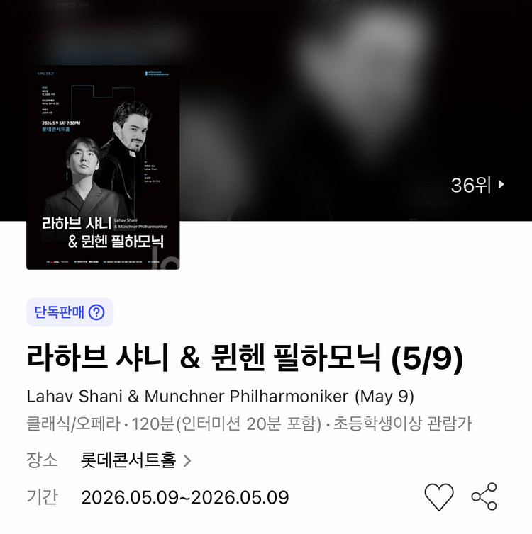 라하브 샤니 & 뮌헨 필하모닉 (조성진 협연) 롯데콘서트홀 #05.09 19:30 토요일 주말 현재(04/14) 마지막 3연석만 남았습니다. 단석, 2연석도 가능 => (구매 문의 채팅) 구매 의사 확정하신 후에 문의 바랍니다. 채팅 일정 시간 이상 무반응 => (차단) ✅ 티켓 양도 프로세스 2번째 사진에 기재해둔 내용처럼 추가금(장당 4만원~)만 선입금받은 후 무통장예매 걸어 드리는 안심 아옮입니다. 거래내역은 충분하니 직접 확인하시기 바랍니다. 입금 완료 후 공연 취소 외 이유불문 환불불가, 티켓 양도는 에비뇽뇽❤️