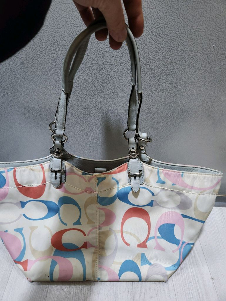 개인정보(거래정보)를 주고받는 행위는 사기에 노출될 수 있으므로 즉시 중고나라로 신고해 주세요정품 오블리크 패턴 토트백이에요. 화이트 바탕에 컬러풀한 로고가 예쁘고 실용적인 사이즈라 데일리로 사용하기 좋아요. 전체적으로 깔끔한 상태입니다 코치가방입니다.