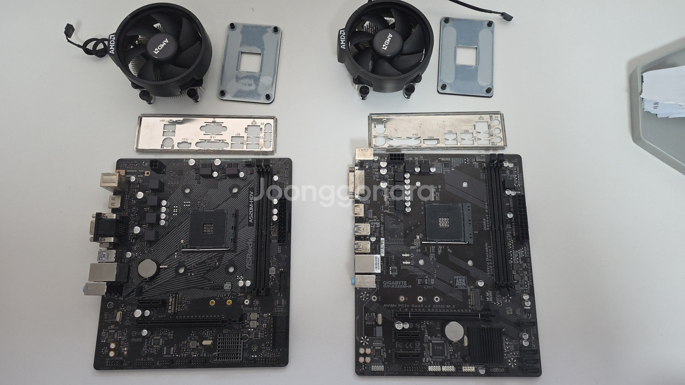 메인보드 + 백패널 + I/O쉴드 + 기쿨 2세트 일괄입니다 ASROCK A520M-HDV 는 최근까지 3700X에 사용하다 탈거한거라 문제 없이 정상작동 가능합니다 GIGABYTE A320M-H 는 창고에 있던건데 CPU가 없어서 작동여부 확인이 불가합니다 (기억 상 바이오스 업데이트 하다 전원꺼져서 바이오스만 다시 잡으면 되는걸로 알고 있습니다) 컴퓨터를 이제 안 써서 두 세트 모두 일괄로 7만원에 판매합니다 안산시 직거래 가능하고, 그 외 우체국택배 입니다