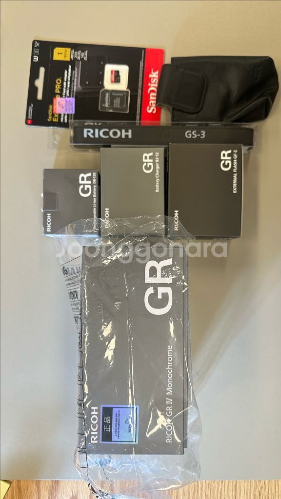 리코 GR IV 모노크롬 카메라와 함께 다양한 구성품을 판매합니다. 모두 미개봉 신품상태이며 일괄로만 판매합니다. 카메라 뿐만 아니라 충전기, 플래시 등은 현재 품절상태로 구하기 어려움을 참고 부탁드립니다. 리코 GR4: 278 만원 (구입가: 279만원) 플래쉬 GF-2: 16만원 (구입가: 16.5만원) 추가배터리 DB-120: 6만원 (구입가: 6.8만원) 충전기 BJ-12: 10만원 (구입가: 10.4만원) 핸드스트랩 GS-3: 6만원 (구입가: 6.6만원) 메모리카드 샌디스크 익스트림 프로 1TB: 34만원 (구입가: 35.5만원) 악세서리만 별도 판매하지는 않습니다. 카메라 및 악세서리의 구성으로만 판매하며 모두 구입하시는 분께는 개봉후 미사용 상태인 가죽케이스 GC-12 (구입가 12.7만원) 을 드립니다. 거래는 목동/신촌 직거래 혹은 택배거래로 진행합니다.