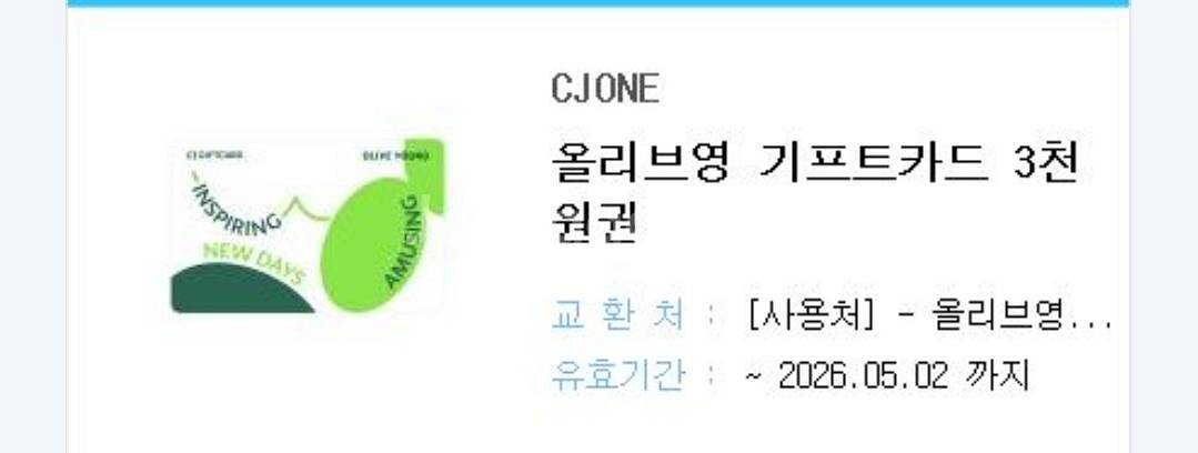 개인정보(거래정보)를 주고받는 행위는 사기에 노출될 수 있으므로 즉시 중고나라로 신고해 주세요올리브영에서 사용 가능한 3천원 기프트카드예요. 유효기간이 2026년 5월2일까지 바코드없고 쿠폰번호로 드려요~