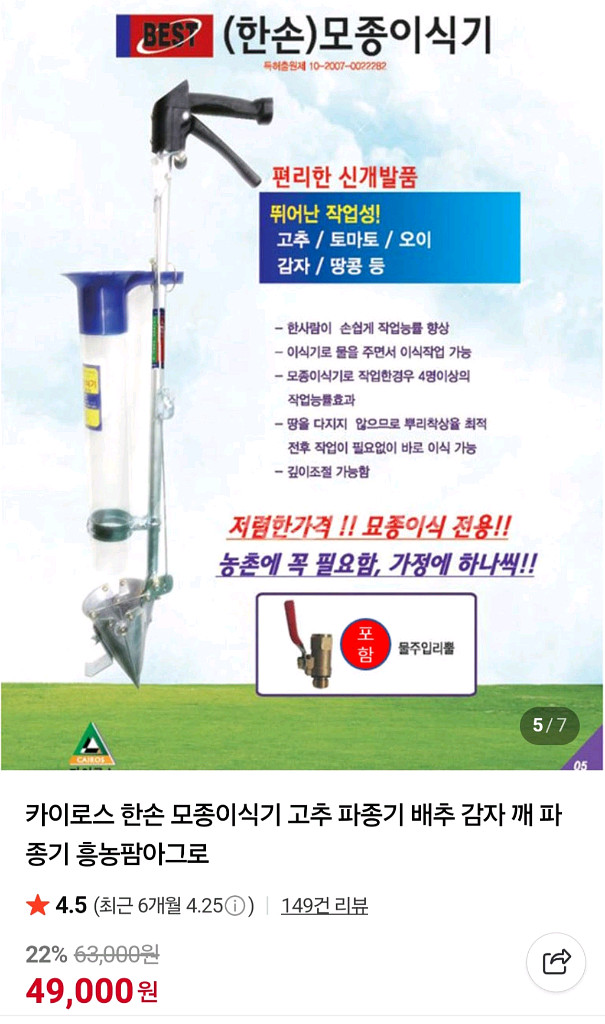 개인정보(거래정보)를 주고받는 행위는 사기에 노출될 수 있으므로 즉시 중고나라로 신고해 주세요카이로스 한손 모종 이식기 2년전 구입 한 제품입니다. 이식기로 물을 주면서 작업 가능합니다. 서서 모종 심을수 있어 좋습니다.