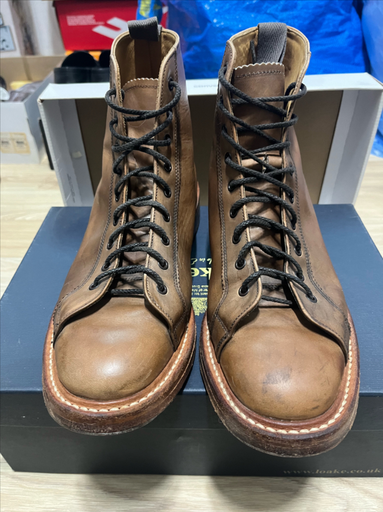 트리커즈(Tricker's) 몽키 부츠 M6259 - UK 8.5 제품 설명 영국의 명품 수제화 브랜드 **트리커즈(Tricker's)**의 대표 모델인 몽키 부츠입니다. 특유의 견고함과 클래식한 디자인으로 워크웨어부터 캐주얼까지 활용도가 매우 높은 신발입니다. • 모델명: M6259 (Monkey Boots) • 사이즈: UK 8.5 (한국 사이즈 270 추천) • 색상: 브라운 (에이징이 멋스럽게 진행된 상태) • 상태: 실착 횟수가 적당히 있어 가죽이 부드럽게 길들여져 착용감이 좋습니다. • 보강 내역: 앞코 마모 방지를 위해 스틸토(철판) 보강 작업이 완료되어 있어, 추가 비용 없이 바로 신으시면 됩니다. 상세 상태 안내 • 가죽 본연의 자연스러운 주름과 빈티지한 에이징이 특징입니다. • 홍창(가죽창) 특성상 바닥 사용감은 있으나, 굽 상태는 아직 짱짱합니다. • 내부 각인 선명하며, 인솔 상태도 깔끔합니다. • 구성품: 단품 중고 거래 특성상 환불은 불가하니 신중하게 결정해 주세요! 고가의 수제화인 만큼 아껴서 신어주실 분이 가져가셨으면 좋겠습니다. 관심 있으신 분은 채팅 주세요! 😊 💡 팁: 사진에 보이는 **앞코의 쇠 부분(스틸토)**은 구두를 아끼는 분들이 따로 돈을 들여서 하는 옵션입니다.