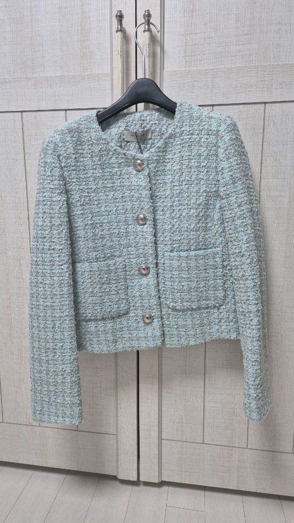 색상이 너무 이쁜 민트색 트위드 자켓이에요. 태그가 그대로 달려있는 새상품입니다 클래식한 디자인으로 다양하게 활용하기 좋아요. 여기서 안심결제만 하겠습니다