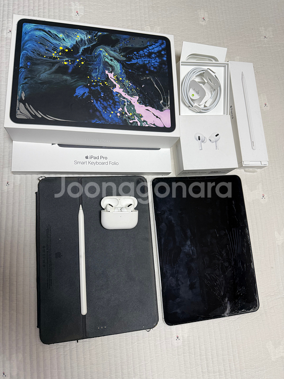 아이패드 프로 1세대 11인치 256 기가 셀룰러 애플 스마트풀리오 애플펜슬 2세대 에어팟 프로 1세대 한꺼번에 팝니다. 박스는 있지만 아이패드안에 충전기랑 케이블은 없습니다. 잠실역 / 문정역 직거래 가능 액정화면 밑에 깨졌지만 터치불량 없습니다. 직거래 잠실역 또는 문정역 가