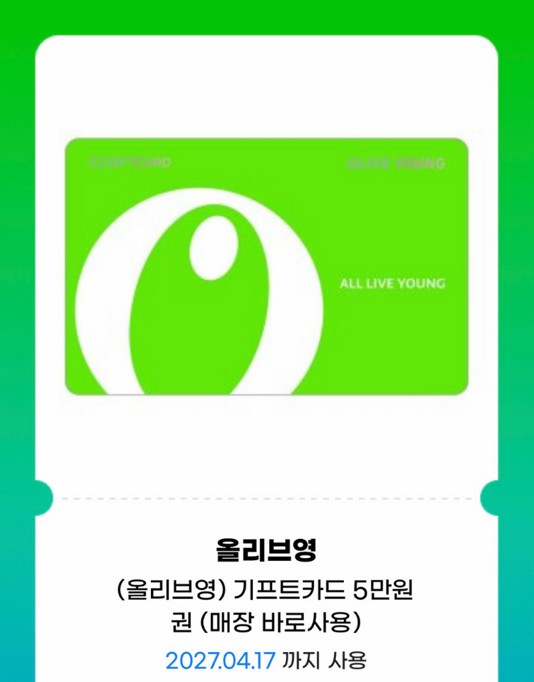 개인정보(거래정보)를 주고받는 행위는 사기에 노출될 수 있으므로 즉시 중고나라로 신고해 주세요올리브영에서 사용 가능한 5만원 기프트카드예요. 2027년 4월까지 사용 가능하니 충분히 활용하실 수 있어요! 필요 없어서 팔아요