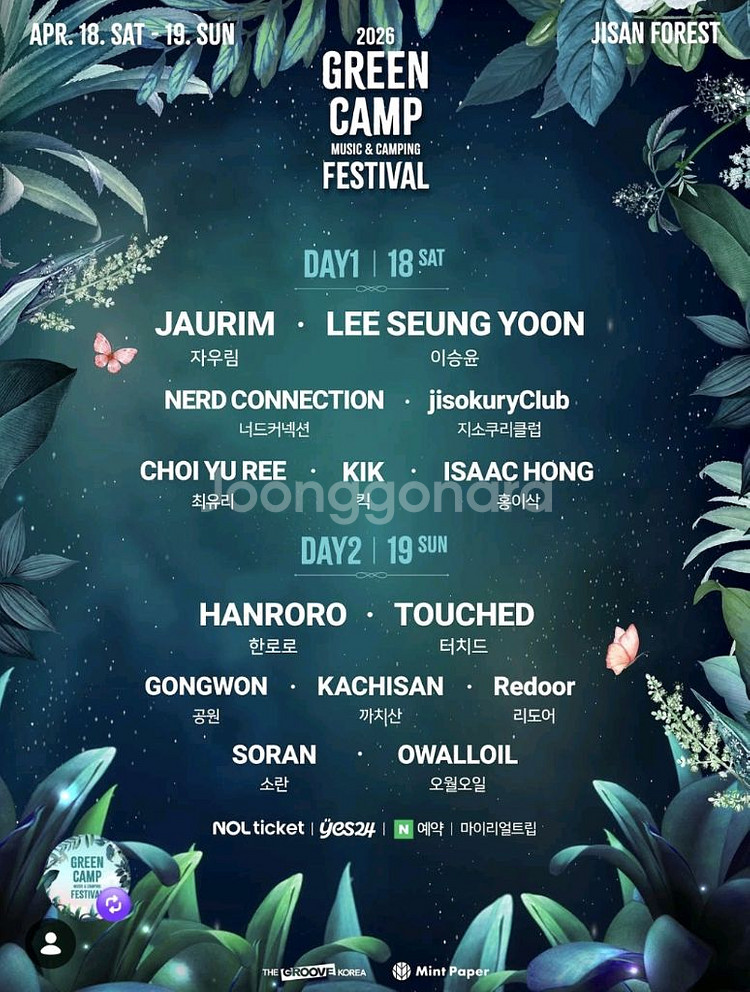 2026 그린캠프페스티벌 뮤직페스티벌 2026.04.18. (토) 자우림 이승윤 너드커넥션 지소쿠리클럽 최유리 킥 홍이삭 장소 지산포레스트리조트 정가 109000원 일일권 장당가격 여러장가능 가족여행으로 못가서 판매합니다 계속 챗주세요 판매완료되면 글 내립니다 전달후 환불불가입니다 쿨거래하시면 네고해드립니다