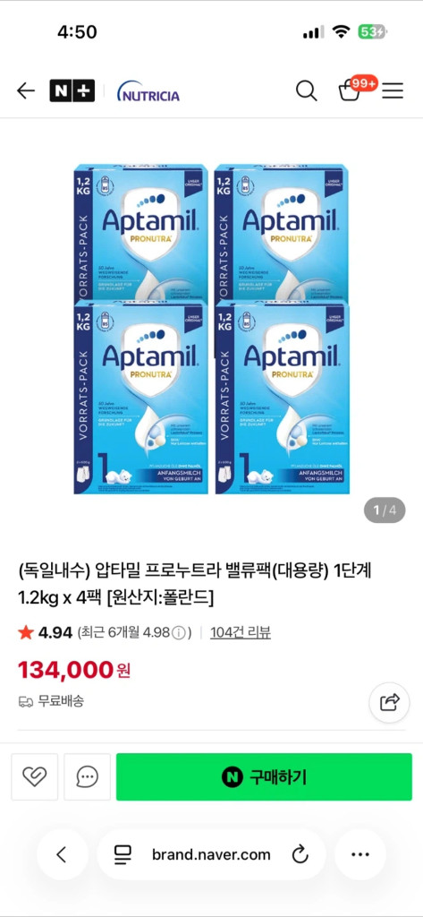 개인정보(거래정보)를 주고받는 행위는 사기에 노출될 수 있으므로 즉시 중고나라로 신고해 주세요독일 내수용 프로누트라 1단계 분유예요. 박스 상태 양호하구요. 유통기한 7월 10일까지라 3달 정도 남았구요. 1.2키로 4개, 총 4.8키로라 잘먹는 아기들은 충분히 먹을거 같네요. (택배비는 따로입니다)