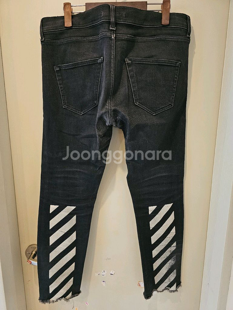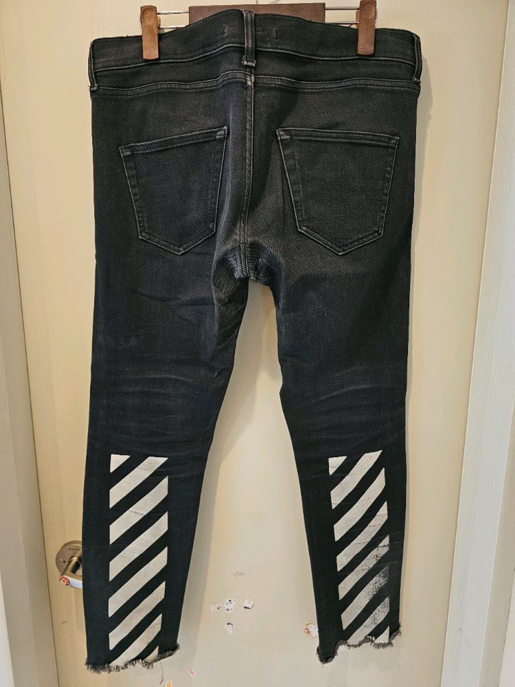 오프화이트의 매력적인 블랙 슬림핏 청바지입니다 사이즈는 32이며, 코튼 99%와 엘라스탄 1%로 편안하게 착용 가능해요 뒷면에 시그니처인 화이트 스트라이프 디테일이 포인트입니다 깔끔하면서도 개성있는 스타일을 연출하고 싶으신 분들께 추천드려요 상태 안좋습니다. 가랭이 찢어짐있어 덧댐흔적 있고 사용감 많습니다. 저렴하게 오프화이트 맛보실 분만 구매해주세요. 상태는 사진으로 직접 확인바라며, 중고 특성상 사진에 잘 안나온 오염이나 손상 등은 있을 수 있습니다. *실측 : 허리45, 허벅지28, 총장94, 밑단15.5cm