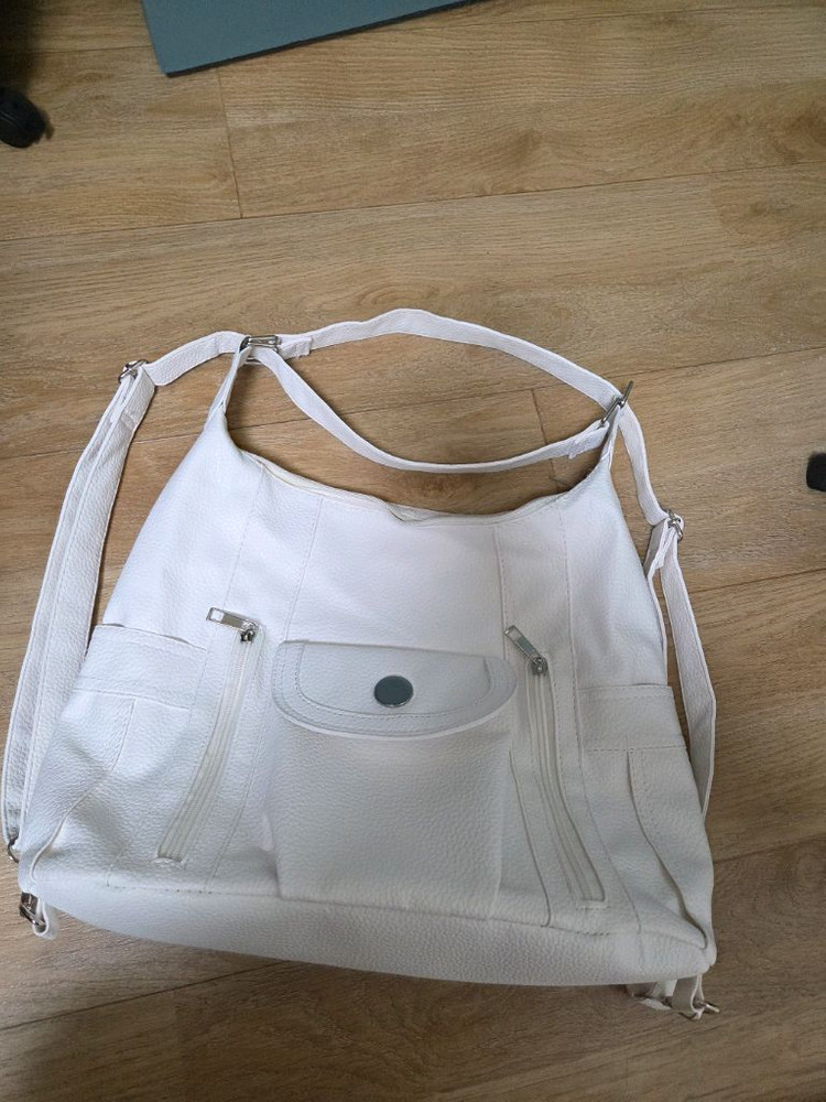 개인정보(거래정보)를 주고받는 행위는 사기에 노출될 수 있으므로 즉시 중고나라로 신고해 주세요깔끔한 화이트 컬러의 백팩 스타일 숄더백이에요. 여러 포켓과 지퍼가 있어서 실용적이고, 전체적으로 상태 양호합니다. 데일리로 사용하기 좋은 심플한 디자인이에요.