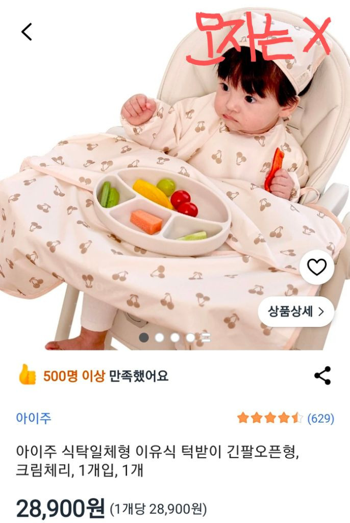 아이주 자기주도 이유식 턱받이 앞치마 실 착용 3~4회 정도 이유식 시작하면 육아레벨이 더 고단한데 조금이라도 도움되었음해요^^ 아기체어에 고정해서 식사하고 턱받이만 벗기고 씻기면 치우기 간편하니 식사시간 엄마의 스트레스를 줄여보셔요~ 오염없고 단추, 끈, 찍찍이 등 모두 상태좋습니다 택만 없고 설명서, 보관함 있습니다