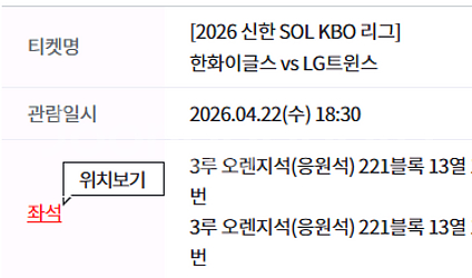 개인정보(거래정보)를 주고받는 행위는 사기에 노출될 수 있으므로 즉시 중고나라로 신고해 주세요[2연석] 4월 22일 LG트윈스 3루 오렌지석 양도합니다. 사진에 상세정보 확인후 채팅주세요 ㅠㅠ 못가게되어서 양도합니다.