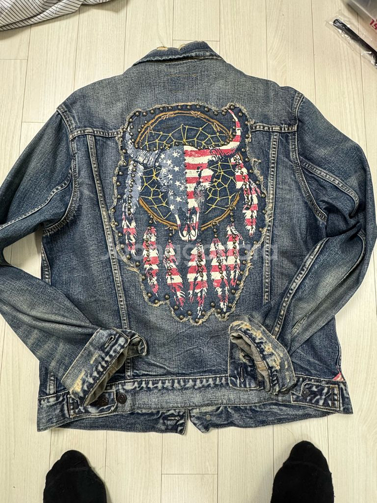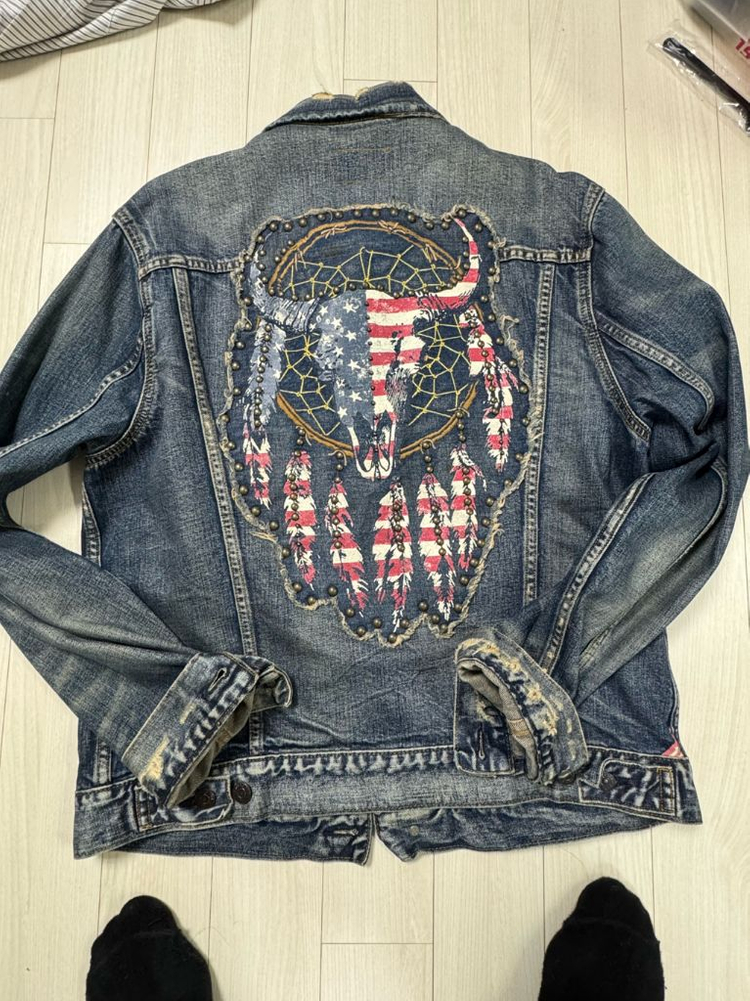 개인정보(거래정보)를 주고받는 행위는 사기에 노출될 수 있으므로 즉시 중고나라로 신고해 주세요정품 데님 자켓으로 뒷면에 독특한 그래픽 디자인이 포인트예요. 전체적으로 사용감은 있지만 상태 양호하고 특유의 빈티지한 느낌이 멋스러워요.