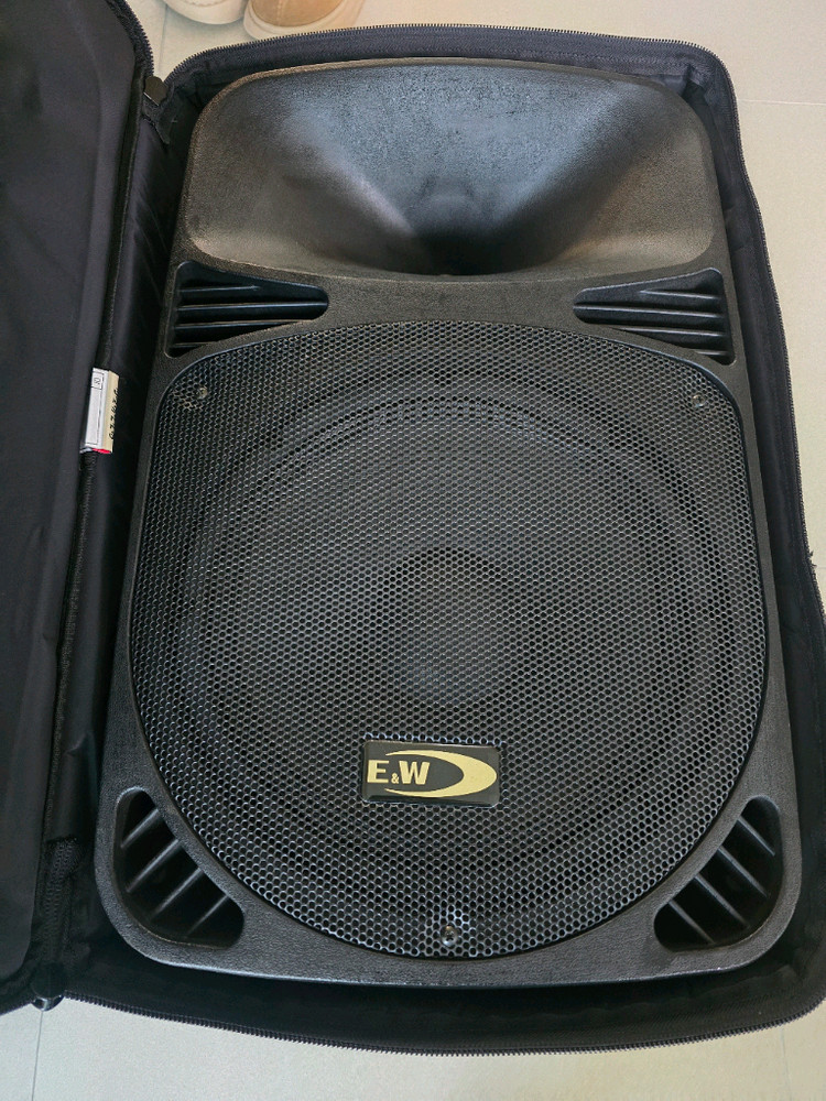 E&W PR-12A 앰프내장형 스피커 판매해요 USB, 블루투스, MP3 플레이어 기능이 탑재되어 있어 다양한 방식으로 음악을 즐길 수 있어요 마이크 2개, 라인 입력까지 가능해서 행사나 모임에 활용하기 좋아요 함께 사용하던 커버도 같이 드려요 전용 케이스 포함 빵빵한 사운드를 원하시는 분들께 추천드려요