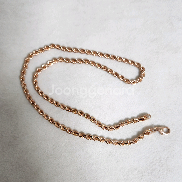 14k 핑크 골드 로프 체인 목걸이입니다 실물은 사진보다 훨씬 예뻐요! - 섬세하게 꼬아져 있는 로프 디자인이 고급스러움을 더합니다 - 14k 골드 소재로 제작되어 변색 걱정 없이 오래 착용할 수 있습니다 - 10.35g(2.76돈) 총길이는 43센티.4미리정도 폭 - 내구성이 뛰어나 오랫동안 예쁘게 착용 가능합니다. 금특성상 저울에따라 중량차이는 약간있을수 있습니다. 교환환불 반품안되니 신중한구매 부탁드려요.
