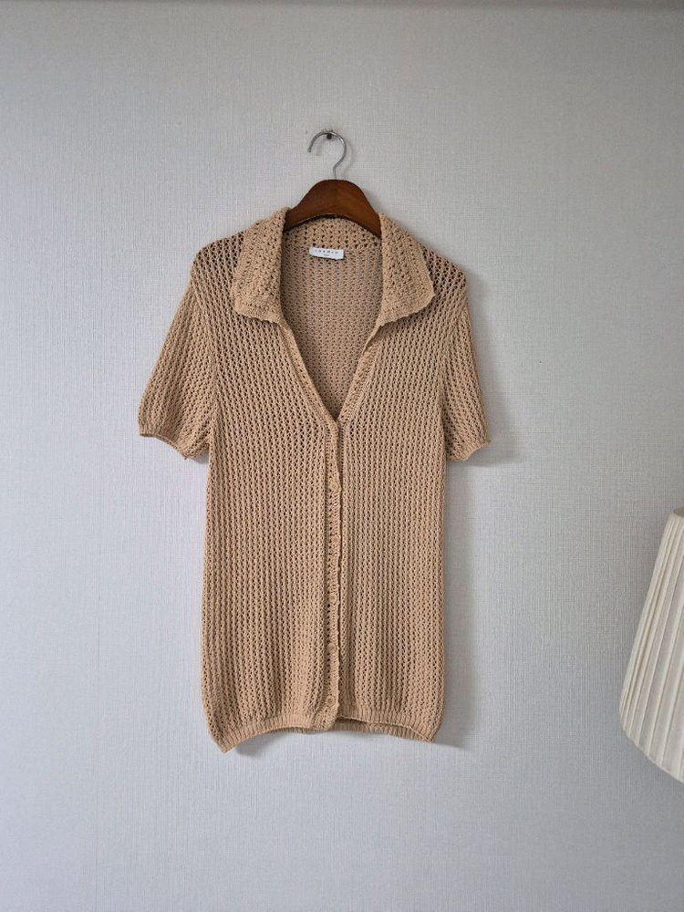 산드로 베이지색 반팔 니트 가디건입니다. 얇은 니트 소재로 여름에도 시원하게 입을 수 있습니다. 단추를 다 잠궈서 니트처럼 연출해도 예뻐요. 맨윗쪽 똑딱이 단추하나 더 달아서 가슴쪽 많이 안보여요 총기장60