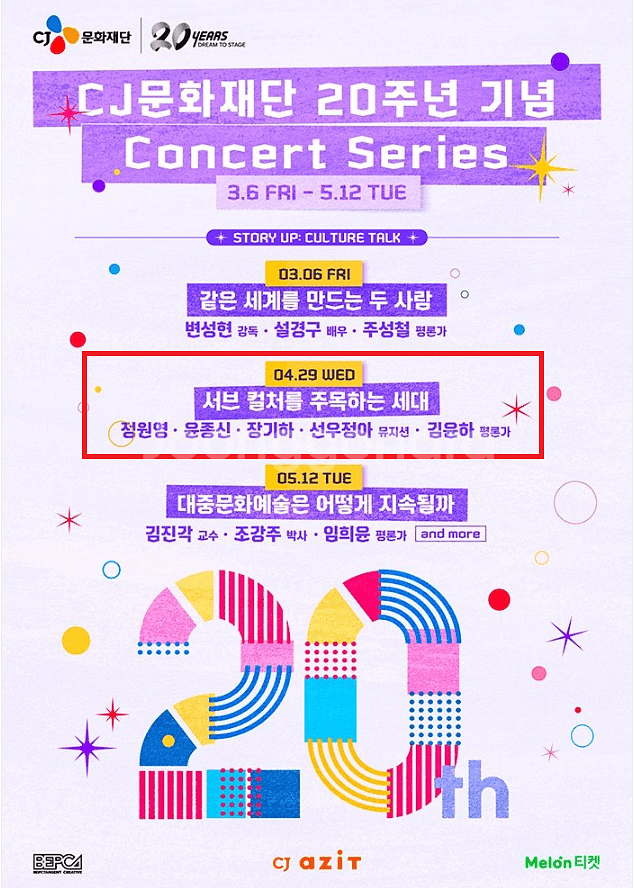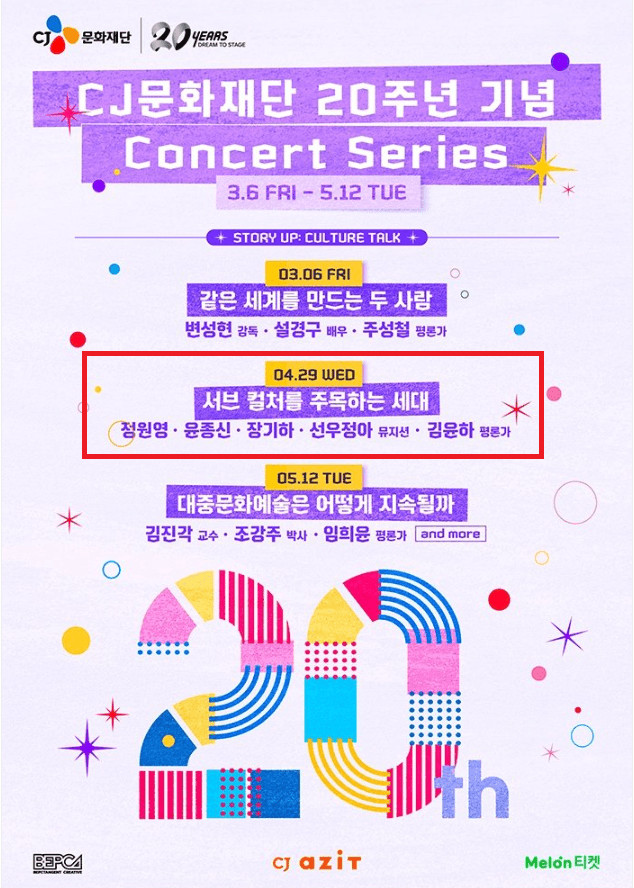 개인정보(거래정보)를 주고받는 행위는 사기에 노출될 수 있으므로 즉시 중고나라로 신고해 주세요CJ문화재단 20주년 기념 Concert Series - [STORY UP: CULTURE TALK] 2026.04.29 윤종신 장기하 선우정아 2열 단석 +2 양도합니다 아옮 해드려요 채팅주세요