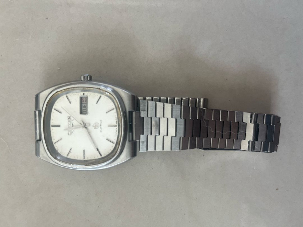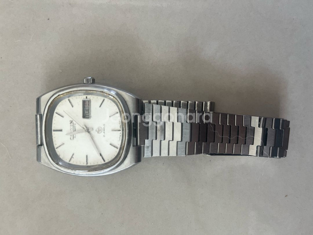 클래식한 빈티지 시계예요. 스테인리스 스틸 케이스와 브레이슬릿으로 되어있고, 화이트 다이얼에 요일/날짜 표시 기능이 있어요. 빈티지 제품 특성상 사용감은 있지만 작동 상태는 양호합니다. 작동은 잘되는데 줄한쪽이 고리가 빠져있네요 시계방가시면 후딱 끼워주실겁니다