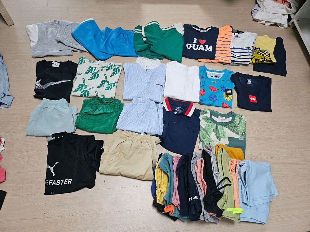 1번째전체삿 바지는 다안찍혀서따로찍어요 남아옷 140전후인데 바지는표기가다달라요150이라돼잇어도엄청작구요 티는130 위주고바지는140전후에요 상하복은 130 이고 파란색상하복은흰부붓때탐이있어요 매쉬소재라엄청잘입었구요 바지는상태좋은데 아무래도여름옷이다보니 티들은세탁감이있어요 3번째사진전체샷리미떼두두 상의엔이염있어요 줄무늬 상하복시원하고이뻐요 표기는140 인데130 일때입혔어요 타미티.뉴밡티.토토헤로스.노스페이스나시130 인데쫌작게나와서못입혔어요.흰색기본티새거 바스락민트바지 검정시원한재질 마지막퓨마는 위아래이염있어서혹시나 필요시넣을께요 상하복이7벌.바지14.티11 정도인것같아요 정리하다나오면 챙겨넣을께요택포 입니다 010 6246 7678 입니다