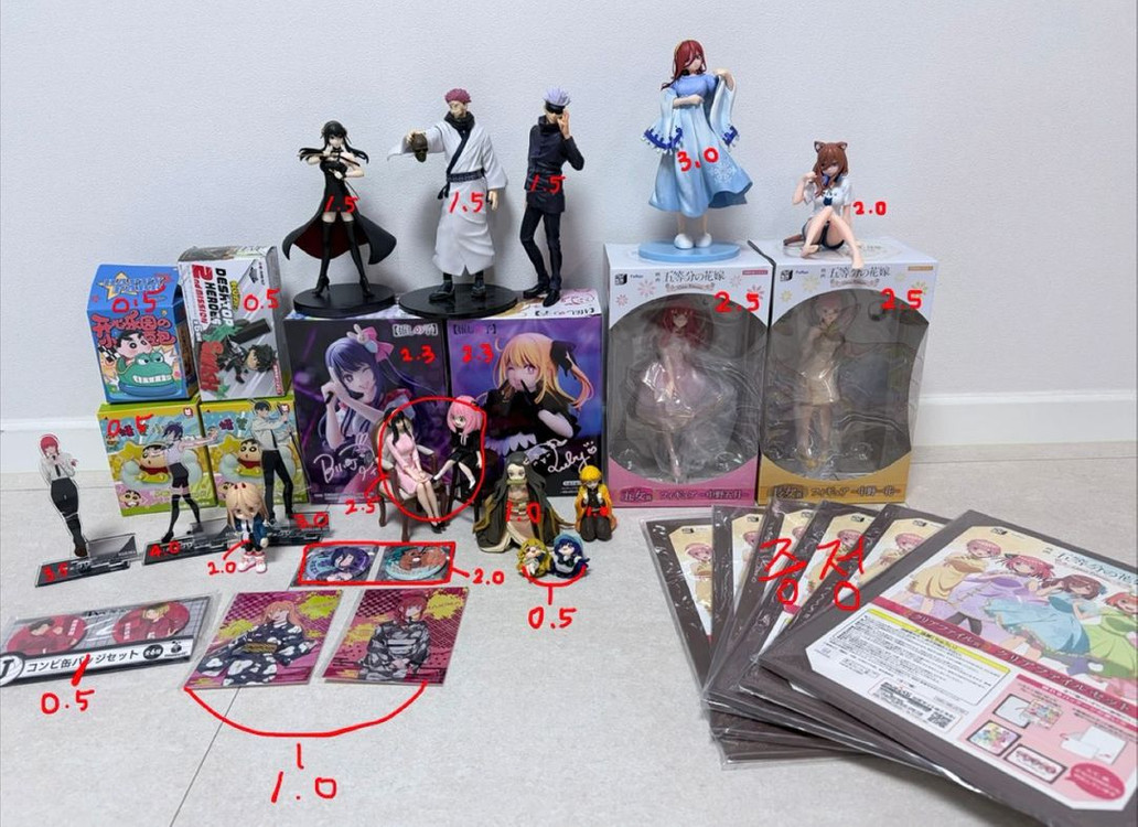 - 가격 1번 사진 참조 / 이하 설명 참조 -박스 가있는 제품은(사진2) 안에 내장재, 비닐까지 전부 있습니다. / 2번 사진 마키마 피규어는 판매된제품입니다 -도쿄 베이스 야드 한정 팝업 마키마, 레제, 아키(3번사진) 아크릴 스텐드 입니다. 비닐포장과 아크릴 떼고 남은 아크릴 부분까지 다 있습니다. / (추가) 천사 아크릴도 있습니다 (3.5판매) 사진을 못찍어서 요청주시면 보내드리겠습니다 -짱구, 히로아카 (3,4번사진) 부평 피규어 샵 에서 이벤트 쿠지로 뽑은겁니다. 내용물만 확인후 포장했습니다. -체인소맨 (5번사진) 오네무탄 가챠 포치타 중복이라 판매합니다. 비닐 안뜯은 미개봉입니다. (판완) -체인소맨(6번사진) 오마츠리 한정팝업 판매제품으로 뱃지는 랜덤이었고 미니 포스터는 7천원에 판매된 제품으로 배송비 1.8에 직구했습니다. -파워 팔버스 피규어(6번사진) 일본 애니메이트에서 레제 영화 개봉전에 산 제품입니다. -하이큐 뱃지 위에 부평 피규어샵 내용과 같습니다. -박스 호시노 아이, 박스 호시노 루비(7번사진) 아이는 일본 덴덴타운에서, 루비는 홍대에서 구매했습니다. -최애의 아이 키링 수원역에서 가챠했습니다. 캡슐있습니다.(7번사진) -스파이패밀리 요르&아냐 의자 피규어 세트 부산에서 사왔습니다. (7번사진) -상자 위 요르 피규어 홍대에서 이치방쿠지로 겟 했습니다. (7번사진) -주술회전 스쿠나, 고죠 도쿄 지바현 근처에서 인형뽑기 기계로 뽑았습니다. (7번사진) - 오등분의 신부 타이토 후류 차이나 프린세스 .ver 쿠지상 입니다. (전부 미개봉) (8,9번 사진) - 미쿠 두개는 부천에서 이벤트 쿠지로 뽑은 제품입니다. (두개 일괄 2.0) - 오등분의 신부 장녀상 5녀상 일괄은 4.0 (박스) -모든 제품은 사용중일때 피규어 전시장에 넣어 전시하였습니다 (마지막 사진) - 1~9번 사진 외에 전시장에 있는 다른 제품 문의는 받지 않겠습니다 + 팔버스 파워 미니피규어 판완 + 요르&아냐 의자 피규어 판완 +고죠 사토루, 료멘 스쿠나 피규어 판완 + 노란박스 짱구 2개 판완 + 호시노 아이,루비 판완 +미쿠 두개 판완
