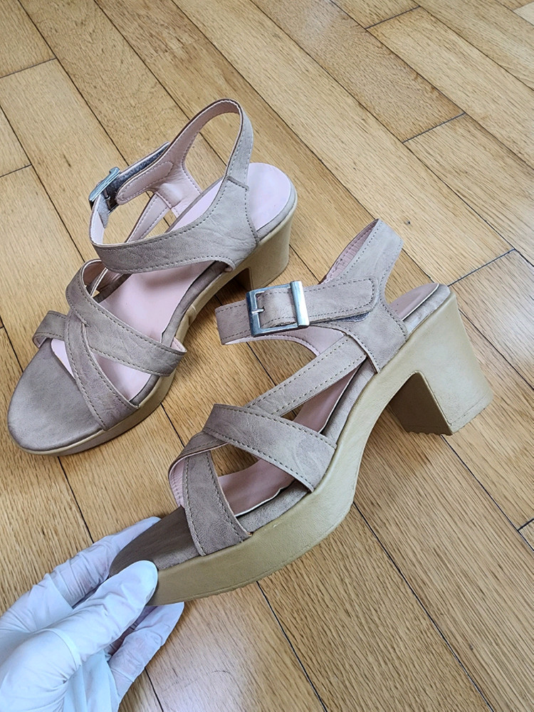 6.5cm 크로스 스트랩 통굽 샌들, 베이지색상 250. 여름에 신기 좋은 키높이 샌들입니다. 6.5cm 굽으로 다리 라인이 예뻐보여요. 베이지 색상이라 짧은 바지나 치마를 입었을때 다리도 길어보입니다. 앞굽에 가보시가 있어서 굽높이 대비 착화감 편합니다. 찍찍이 벨크로라서 길이 조절도 편하고 신고 벗기도 쉽습니다. 사이즈 미스로 한번도 못신었습니다. 실착0회, 박스/텍은 불포함. 250정사이즈 추천 구매가 35,000원, 일산 태영프라자 리젠시 오프라인 매장에서 구입. 15,000원 + 배송비에 판매합니다. 별도 문의 없으시면 바로 안심결제 부탁드려요!