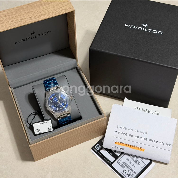 안녕하세요. 해밀턴 카키필드 오토 38mm 판매합니다. (H70455140) 신형 블루 다이얼입니다. 26년 03월 정식 스탬핑입니다. 출장 가면서 막 착용할 툴워치로 구매했는데 취향이 아니네요. 까먹고있다 올려요. 새제품이라 별도로 설명드릴 건 없습니다. 사이즈 : 38mm 판매가격 : 83만원(절충 불가) 인천 송림4동 성당 앞 직거래 희망합니다. 피곤한 거래 싫어합니다. 구매 결정 완료된 분만 연락주세요.