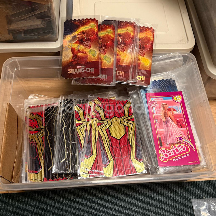 오리지널 티켓 스파이더맨 노웨이홈 A(레드수트) 25000 스파이더맨 노웨이홈 B(블랙수트) 18000 샹치 12000 바비 13000 ** 오티 5개 이상 시 CU 알뜰택배 무료 모든 오티 상태 최상 / 수령 직후 OPP 비닐 보관 아트카드 필름마크 TTT 스페셜티켓 무비티켓 등 다른 시그니처 굿즈도 대다수 있으니 문의주세요 알뜰반값택배 2500 / 일반택배 4500 포장 안전하게 보내드립니다