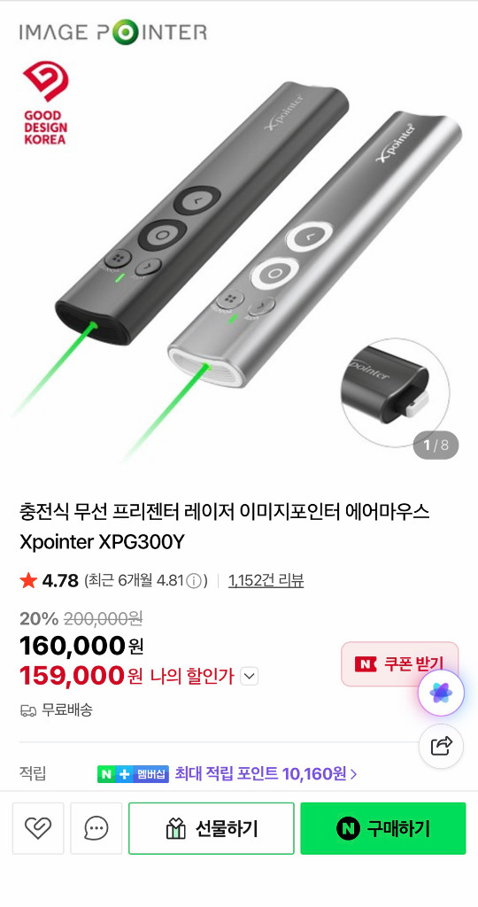 Xpointer XPG300Y 무선으로 사용 가능한 프레젠테이션용 레이저 포인터예요. 강의나 발표할때 에어마우스 시청자와의 연결을 도와주는 실용적인 전문가용으로 평생소장용 아이템입니다. 미개봉 새상품 입니다 인터넷 최저가 확인해보세요! 159000원구매 -> 125000원 급처해요!