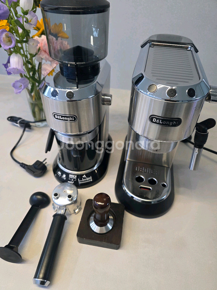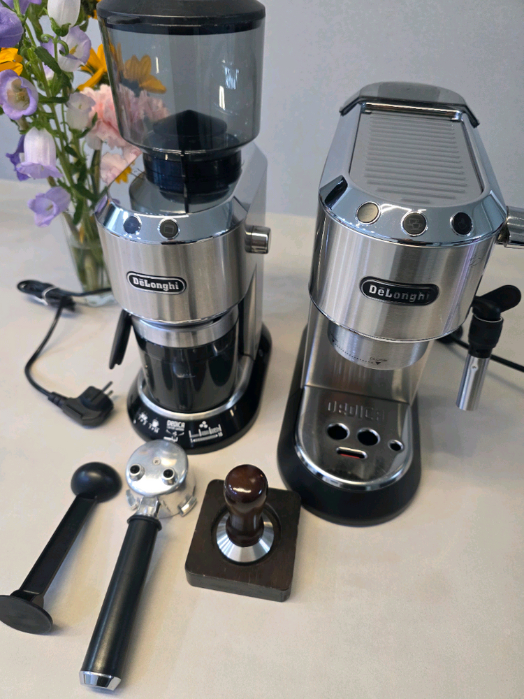 드롱기 데디카 에스프레소 머신과 그라인더(kg520m) 세트입니다 구성품은 사진과 같아요 드롱기는 세련된 디자인으로 주방 어디에 두어도 잘 어울린답니다 그라인더는 드롱기 저가 모델이 아닌 에스프레소머신과 딱 어울리는 모델입니다 깨끗하게 세척해 놓았습니다 판매내역 많으니 챗. 쪽지 댓글 주세요~
