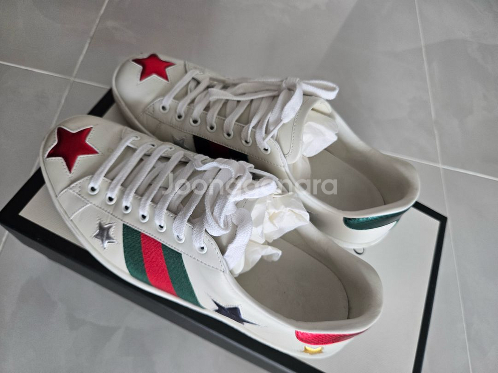 개인정보(거래정보)를 주고받는 행위는 사기에 노출될 수 있으므로 즉시 중고나라로 신고해 주세요구찌 에이스 스니커즈입니다 265사이즈 화이트 색상에 별 장식이 포인트입니다 - 가볍고 편안한 착용감을 제공합니다 - 다양한 스타일에 매치하기 용이합니다 박스, 카드 함께 드립니다 실착2번