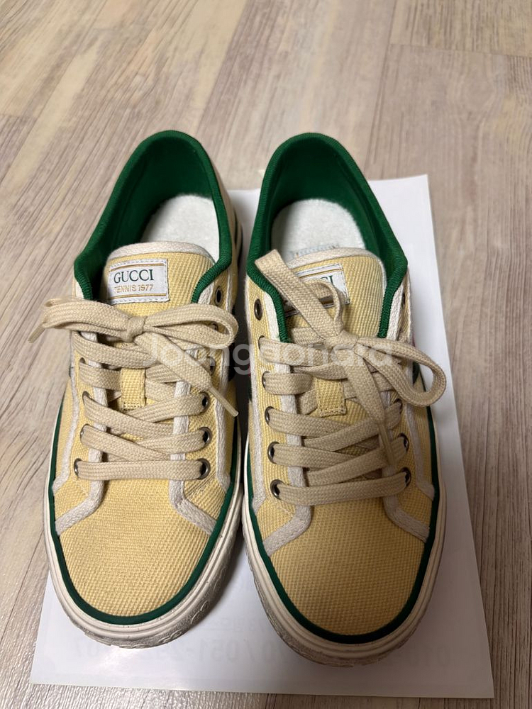 구찌 테니스 1977 스니커즈 37+ 사이즈예요 깔끔한 디자인이에요 봄 여름 신기 좋아요~!! 더스트백+박스+여유끈 포함 구성입니다 센텀신세계에서 구매 후 딱 1번착용 (구매내역 인증가능) 1번신고 보관만 했어요 디자인은 흰색부분은 원래 빈티지하게 저렇게 나온겁니다 사실분 연락주세요!