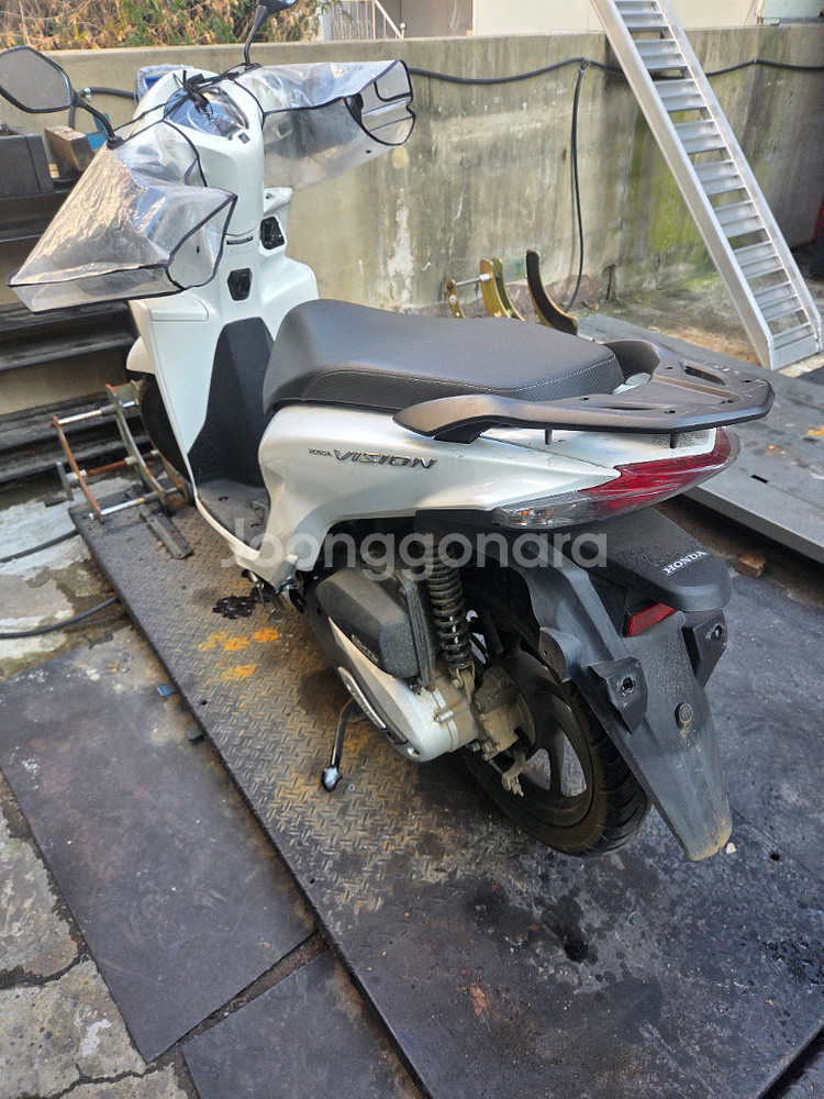 혼다 비전 22년식이고 주행거리 19800. 오일교환은 메뉴얼대로 잘 관리했고 잘가고 잘서요. 주행문제는 없어요.기변으로 팝니다. 우측넘어짐으로 앞휀다 벌어짐과 배기관커버(플라스틱)파손. 스크레치있어요.출퇴근용으로 사용했고 외관상 화이트 컬러라 새차만하면 깨끗합니다. 26년2월에 배터리 교체함. 안전모.탑박스는 없고 통풍시트커버는 필요하시면 드려요. 상태보시고 적정선에서 네고가능합니다. 오토바이는 혼다 거제점에있습니다. 보실려면 주중에 오시면 됩니다. 주말은 영업안해요. 폐지,서류준비완료!