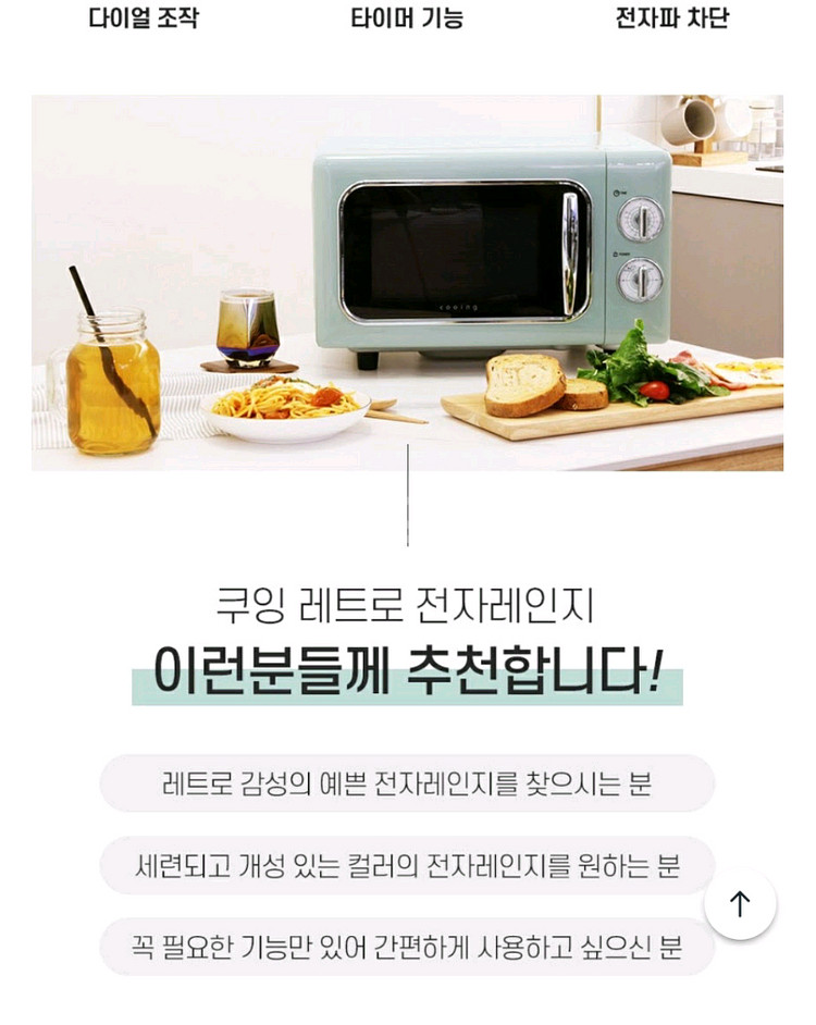 쿠잉 레트로 전자레인지 파스텔 민트색상입니다 새상품급으로 상태 아주 깨끗하고 좋습니다 레트로 디자인으로 주방 인테리어 효과도 뛰어나요 다이얼 방식으로 조작이 간편하며, 20L 용량으로 넉넉하게 사용할 수 있습니다 700W 출력으로 음식을 빠르게 데울 수 있고, 5단계 출력 조절과 해동 기능이 있어 편리합니다 최대 30분 타이머 설정도 가능해요 https://www.coupang.com/vp/products/8816948911