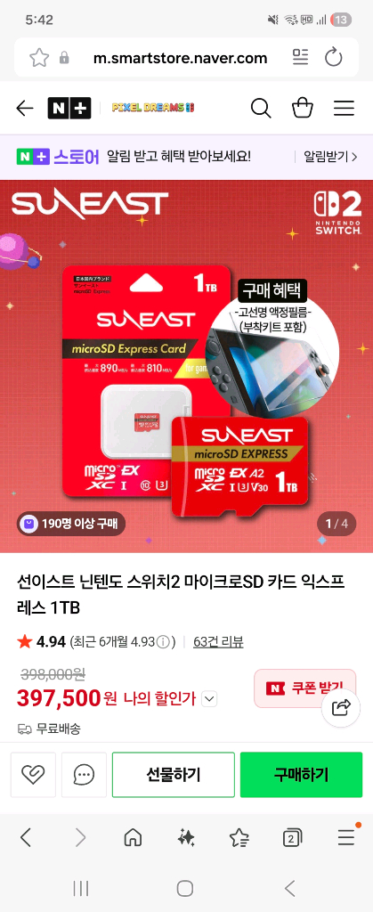 닌텐도 스위치2 마이크로 SD카드 익스프레스 외장 메모리카드 1TB 선이스트 1번사용