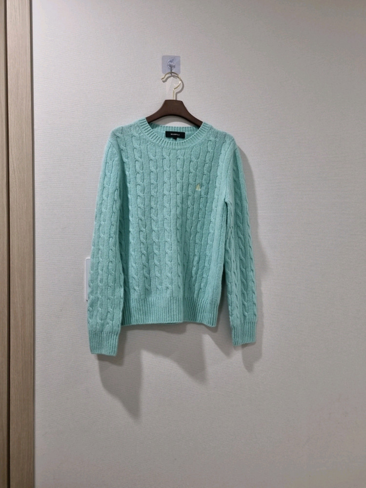 빈폴의 매력적인 민트색 케이블 니트예요 사진에서 보이는 것처럼 깔끔한 디자인이 돋보여요 사이즈 M 가단49 총장59 양모 알파카 혼방입니다. 부드러운 소재로 편안하게 착용 가능해요 어떤 하의와도 잘 어울리는 활용도 높은 니트에요 작년구매입니다. 깨끗해요