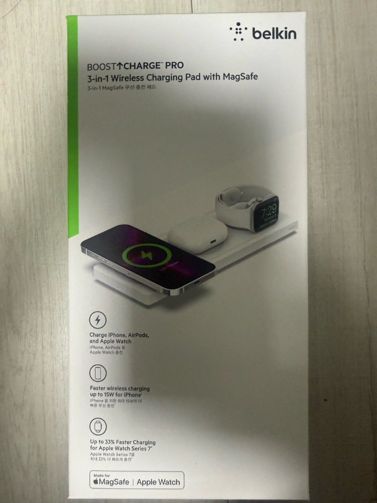 아이폰, 에어팟, 애플워치를 한 번에 충전할 수 있는 벨킨 3in1 맥세이프 무선 충전패드예요 최대 15W 고속 무선 충전을 지원하며, 애플워치 시리즈 7의 경우 최대 33% 더 빠르게 충전할 수 있어요 깔끔한 디자인으로 어디에 두어도 잘 어울려요 여러 기기를 동시에 충전하고 싶으신 분들께 추천드려요 Wiz016kr 모델입니다