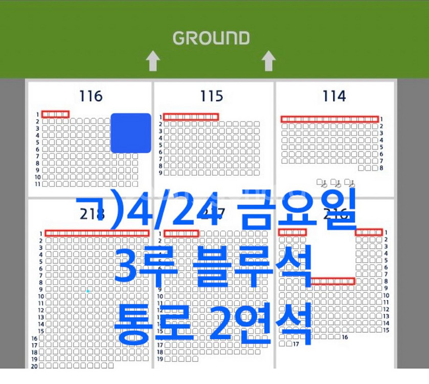 4월24일(금) 잠실 두산vs엘지 3루 블루석 통로 2연석, 중앙네이비 통로 3연석 4/24 금요일 잠실 두산베어스 VS LG트윈스 ㄱ) 4/24(금) 3루 블루석 116블럭 통로2연석 장당 4만 ㄴ) 4/24(금) 중앙네이비 320블럭 통로 3연석 (완료) ★ 모바일티켓으로 전송해드립니다. ★ 우취 또는 KBO 공식 경기취소시에만 환불 해드리며, 그 외에는 환불되지 않습니다.