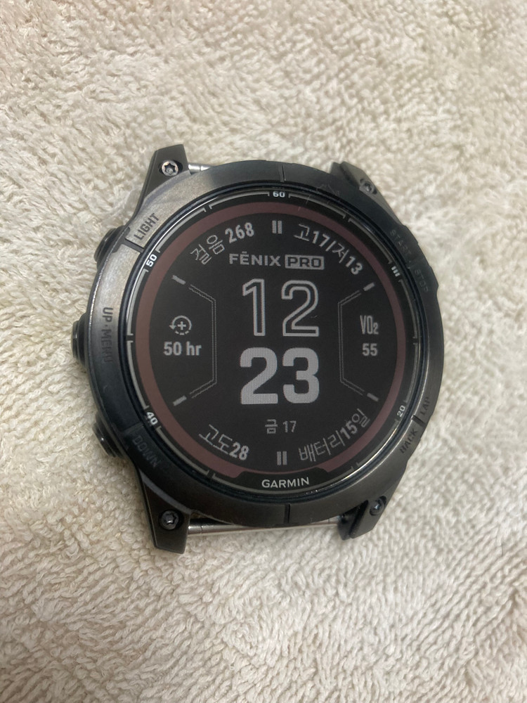 가민 피닉스7 프로 사파이어 솔라 (카본그레이 색상) 구매 시기: 2026년 2월 (보증기간 27년 2월까지 10개월가량 남음) 구성품: 풀박스, 본체, 케이블, 충전단자마개, 여분필름, 추가 스트랩 2종 아몰레드 디스플레이를 딱히 고집하지 않으신다면 현존 MIP 디스플레이 제품군 중에 가성비 좋은 모델이라고 보셔도 됩니다. - 내장 LED 플래시라이트 - 최신 5세대 심박 센서 적용 모델 (중고가 비슷한 965도 4세대) - 배터리 2주 이상 사용가능 + 태양광 충전 베젤은 티타늄 재질이라 약간의 사용감은 존재하지만 액정은 사파이어 글래스 모델이라 기스 걱정은 안 하셔도 되고, 계속 보호필름 부착하고 사용했습니다. 구매한지 2개월 정도밖에 안되서 배터리 효율 최상이며, 모든 기능 정상 작동하고 버튼 5개 모두 클릭감 양호합니다. 구매 진행 시 택배 배송 이후 영수증 및 구매내역 첨부해드립니다. 잔여 보증기간이 여유로워 충분히 메리트 있는 상품이라 생각합니다. 편하게 문의 주세요.