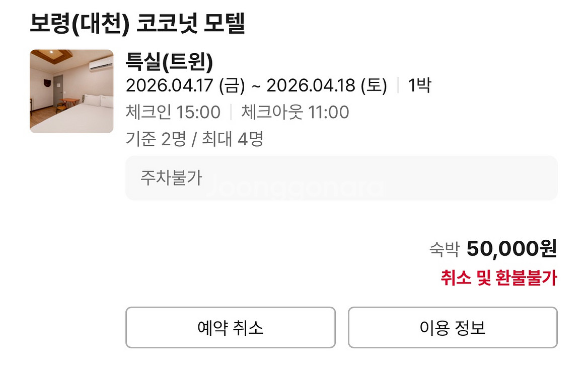개인정보(거래정보)를 주고받는 행위는 사기에 노출될 수 있으므로 즉시 중고나라로 신고해 주세요코코넛 모텔 특실 트윈룸 4월 17일부터 18일까지 사용 가능한 숙박권이에요. 기준 2명/최대 4명 규격으로 주차불가 상품입니다.