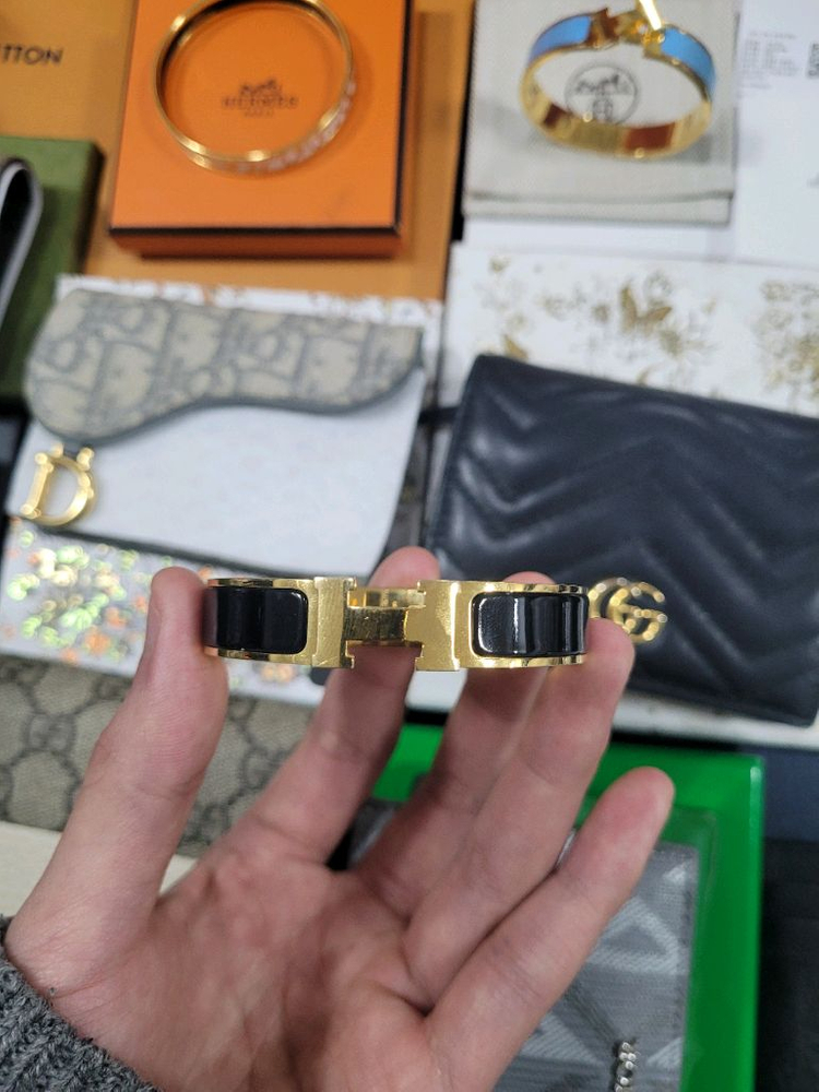 브랜드 – 에르메스 (HERMÈS) 제품명 – 클릭 아슈(Clic H) 브레이슬릿 PM 블랙 골드 사이즈 – PM (손목 약 16cm 전후 착용 적합) 구성품 – 단품 색상 – 블랙 / 골드 재질 – 메탈(골드톤 하드웨어) / 에나멜(블랙) 상태 – 전체적으로 사용감 있는 중고 상태 골드 부분 잔기스 및 스크래치 존재 에나멜 부분 생활기스 있으나 깨짐/크랙 없음 잠금장치 정상 작동 매장주소: 김유정로 1417 B동 104호 1층입니다. 김유정역 도보 1분 거리에 있어요. 감정서 발급: 비용 구매자 부담