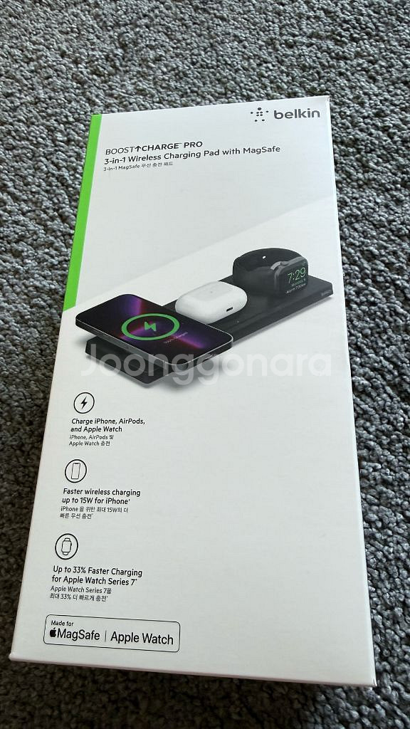 벨킨 3in1 맥세이프 충전기 (박스 풀 거의 새제품) 입니다 구입후 테스트 정도하고 거의 사용 하지 않고 보관하다가 판매하며 구입시 구성 그대로 입니다(당연히 작동 이상 없어요) 실리콘 재질로 고급스러우며 애플 맥세이프 인증 및 워치도 고속 충전되는 모델입니다 박스도 상태 좋고 박스 이미지 보시면 아이폰 등 같이 디자인 되어 있는게 비교적 최근 생산품 입니다 자세한 내용은 사진 참고 부탁드리며 불필요한 문의는 받지 않습니다 신촌숲아이파크 인근에서 직거래 가능하고 택배도 가능합니다