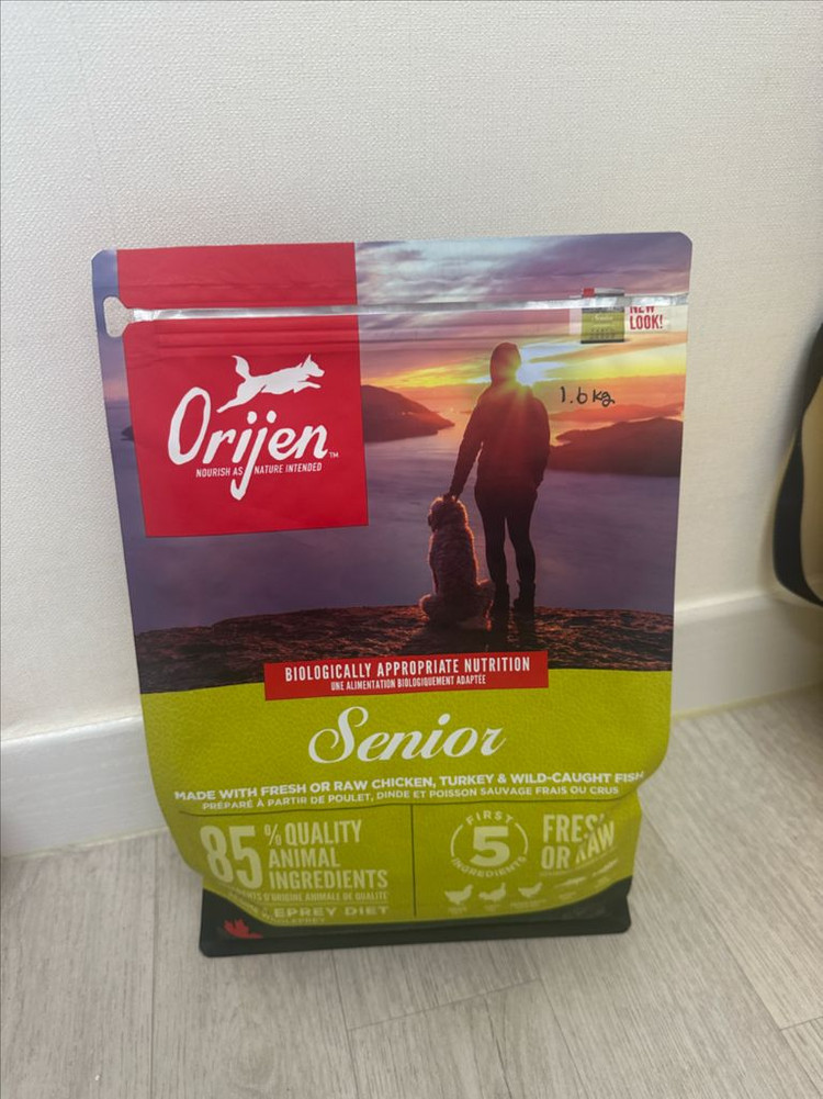 오리젠 시니어 강아지 사료 1.6kg입니다 3만원중반에 구매했고 400g 정도 급여했어요 구매한지 얼마 안되었는데 저희 강아지가 닭알러지 의심되서 급여중단 후 판매해요ㅠㅠ 습기 제거제 넣어서 신선하게 보관중입니다. 소비기한 : 2026년 12월 31일까지