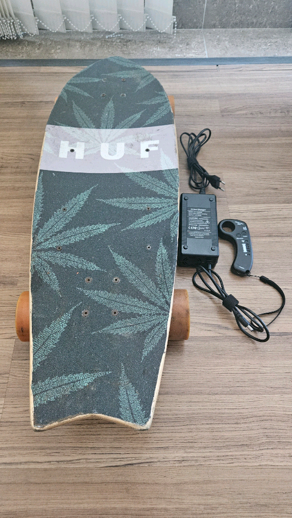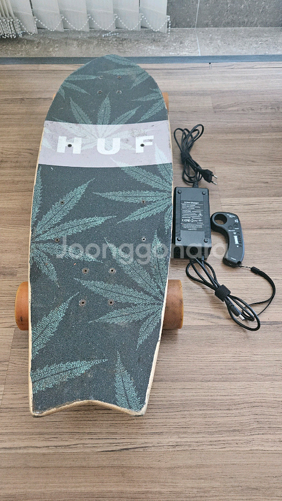 전동 스케이트보드 판매해요! 충전기와 함께 구성되어 있고 사용감은 있지만 작동 잘 됩니다. 라이딩 취미로 많이 타던 제품이라 실용적이에요. 마지막 사진에 바닥 플라스틱 케이스에 실금이 있어 강력접착제 바른흔적 있어요. 사용상 이상 없습니다.리모컨.충전기 포함