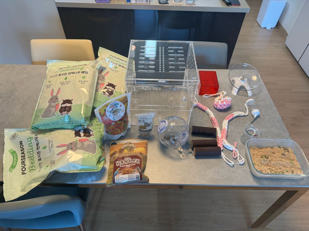 피그미 다람쥐 케이스 및 용품 풀셋트 판매합니다. 구성품 목록은 케이스, 물통, 챗바퀴, 은신처, 놀이기구 3개 밥그릇, 발톱갈이 3개, 이갈이 사료, 과일사료, 건조 밀웜, 베딩 새거 3개 사용중 1개, 산책용 볼, 온열필름, 온습도계 이며 추가로 구매하실 물품 일체 없습니다. 사진에 아이는 핸들링 훈련 완료된 수컷 4개월입니다.