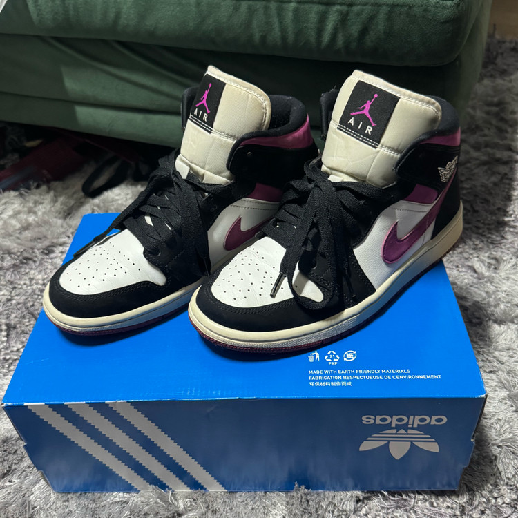 나이키 에어조던1 미드 BQ6472-005 판매합니다 제품명은 레드인데 컬러는 블랙이랑 핑크 입니다 핑크 들어가 있는 부분 재질은 약간 보들보들 한 재질이에요 사이즈: 240 상태: 사용감 있지만 전체적으로 양호합니다! (앞코 주름, 밑창 사용감 있음 , 왼쪽 혓바닥 근처 약간 까짐 정도 의 사용감만 있습니다 사진 참고) 제가 발등이 높아서 불편해서 많이 안신었어요ㅠ 아까워서 신발장 처박 해두다가 판매합니다 가격 제안 편하게 주세요 착용 문제 없고 데일리로 신기 좋습니다 여성분들 치마 입고 매치 하시거나 여성스러운 옷 입으시고 발 불편한 신발 신으시기 힘드실때 신기 좋아요