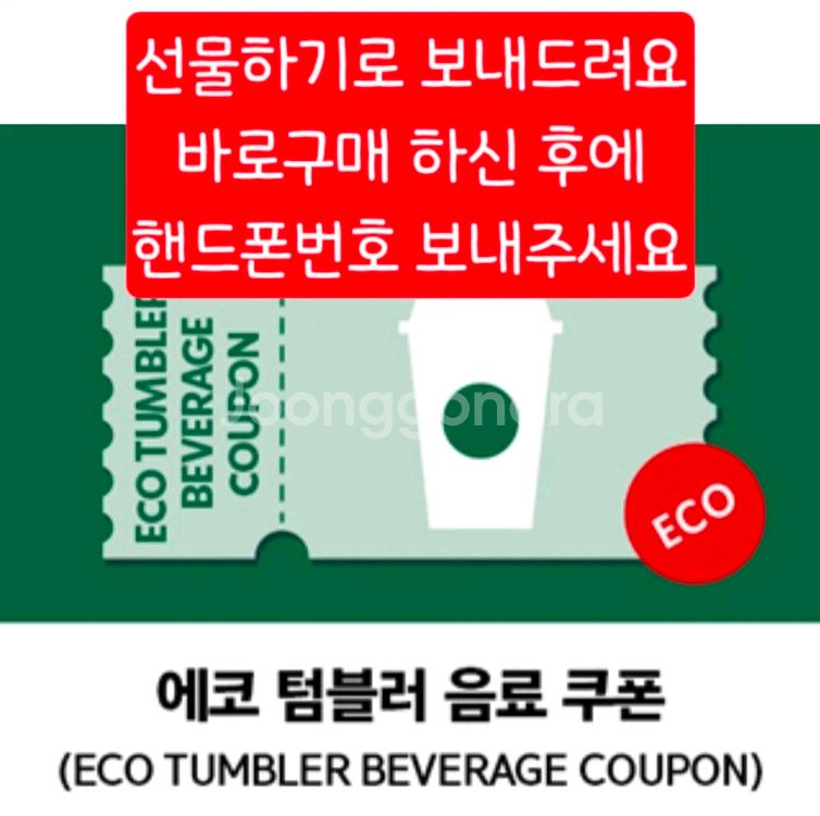 개인정보(거래정보)를 주고받는 행위는 사기에 노출될 수 있으므로 즉시 중고나라로 신고해 주세요스벅 에코 텀블러 쿠폰 5월 2일까지 4500원에 팝니다 입금 하고 폰 번호 보내주면 스벅앱에 선물하기로 보내드려요.