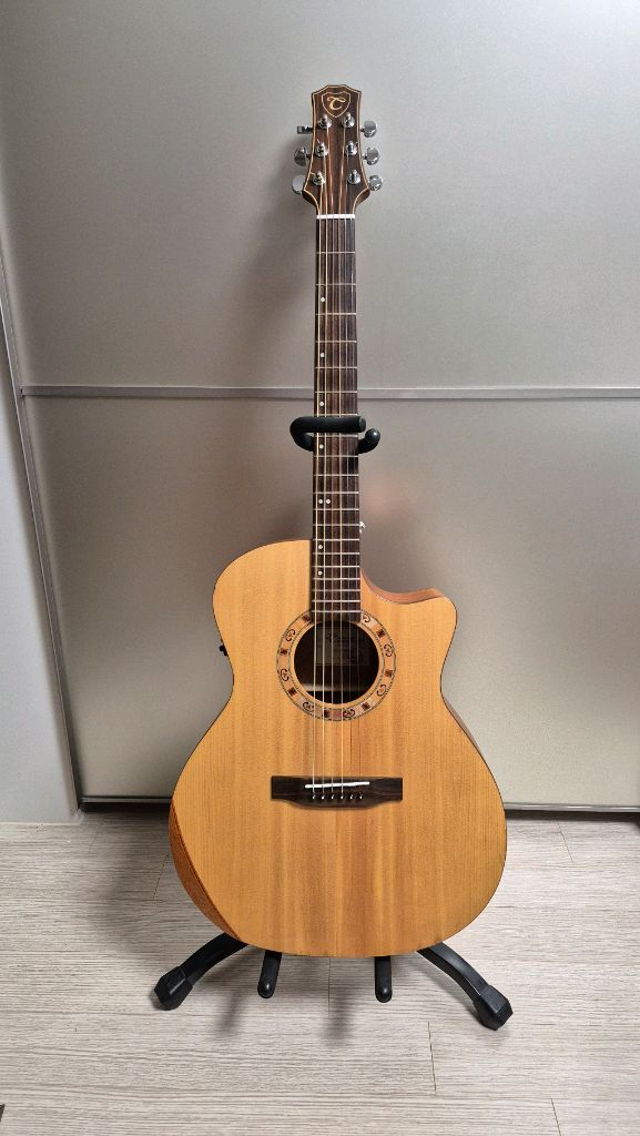 ● 모델명 : Tonewood TC-SOP EQ 어쿠스틱 기타 ● 제품정보 튜너기능을 포함한 EQ장치가 내장된 탑솔리드 중급자용 김성웅님이 제작하신 수제 어쿠스틱 기타입니다. 기타상태는 사진그대로 양호하고 깨끗합니다. 신품가 43만원합니다. 묵직하고 깊은 저음과 시트카스프루스 단판(Solid)의 밝고 명료한 고음이 조화를 이루는 것이 이 기타의 장점입니다. 특히 컷어웨이가 적용되어 높은 프렛에서의 연주가 용이하며, 입문 단계를 넘어 중급자로 넘어가는 분들이나 가성비 좋은 공연용 기타를 찾는 분들에게 적합한 모델입니다. 새줄로 교체하여 조율완료, 현높이 최적으로 조정 등 셋업작업 완료한 상태로 구매후 바로 연주가능합니다. 택배가능하며, 직접 오셔서 시연후 구매도 가능합니다. ● 구성품 : 기타본체, 소프트케이스, 피크, 스트랩, 카포, 줄감개, 육각렌치