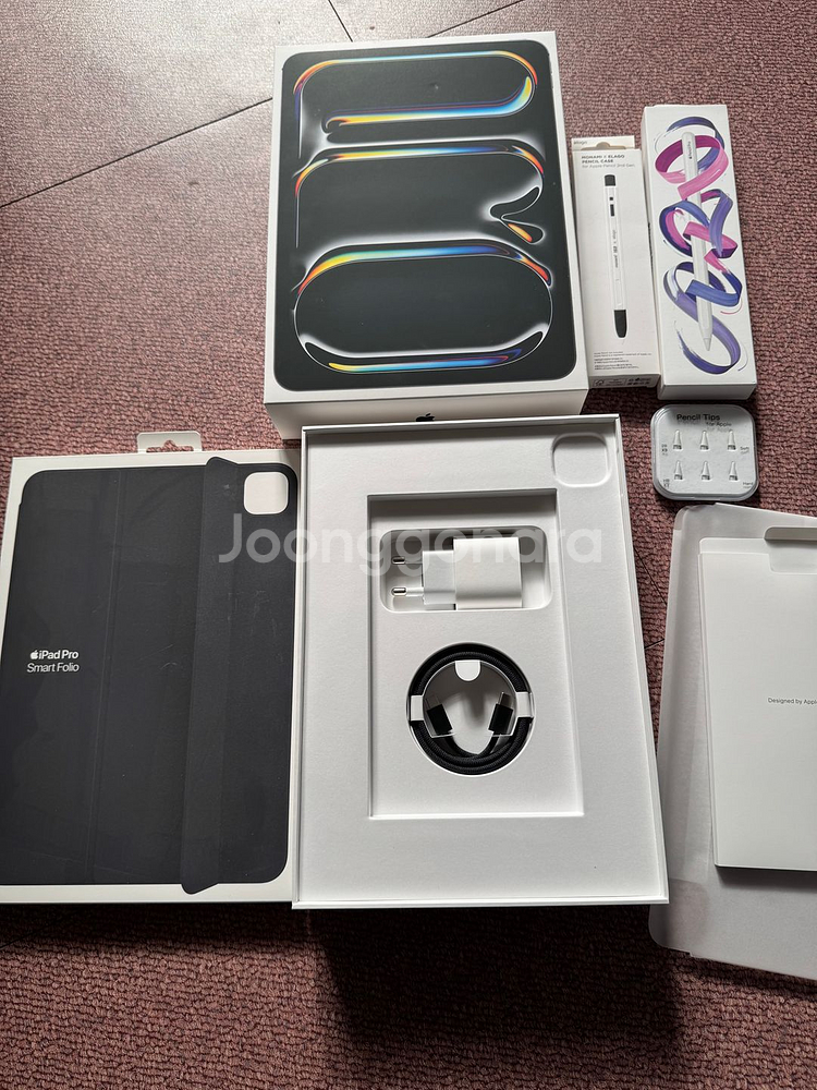 아이패드 프로 m4 pro 256GB WIFI 배터리 성능 100% + 애플펜슬 프로 ( 모나미 케이스도 있습니다 ) + 아이패드 프로 m4 정품 케이스 3개 제품 전부 풀박스 구성. 용도 : 넷플릭스, 쿠팡플레이, 유튜브. 색상 스페이스 블랙 --- 사진이 애매하거나 부족한 부분이 많습니다. 곧 수정할 예정입니다. 구매를 원하시는 분들은 언제든지 문의주시기 바랍니다. 그냥 충전해두고 방치만 하듯이 완전 깨끗한 제품입니다. 배터리 성능도 100%이며 필름은 제거하고 사용하셔도 되고 그냥 쓰셔도 됩니다. 사자마자 필름을 붙인거라서 화면은 두말할 필요가 없습니당 대전 전지역 거래 가능합니다.